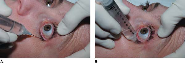 Using a 30-gauge needle and a 10-cc syringe containing the anesthetic agent, raise a skin wheal 8 to 10 mm posterior to the lid margin so as to be inferior to the tarsal plate and in the center of the inferior temporal quadrant. B: A 27-gauge, 31-mm disposable needle is placed on the same syringe, and the lower lid is immobilized by the needle tip so that it is at the level of the equator of the globe prior to penetrating the skin. |