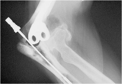 An allograft has been used to replace the proximal ulna. The allograft has been secured with a semitubular plate with single cortical screws. The screws are stabilized with cement. |