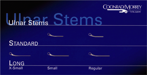 The small and standard-sized ulnar components are available for routine ulnar component revisions. If the previous implant has been associated with a fracture or the tip of the implant must be bypassed, several longer components are available. |