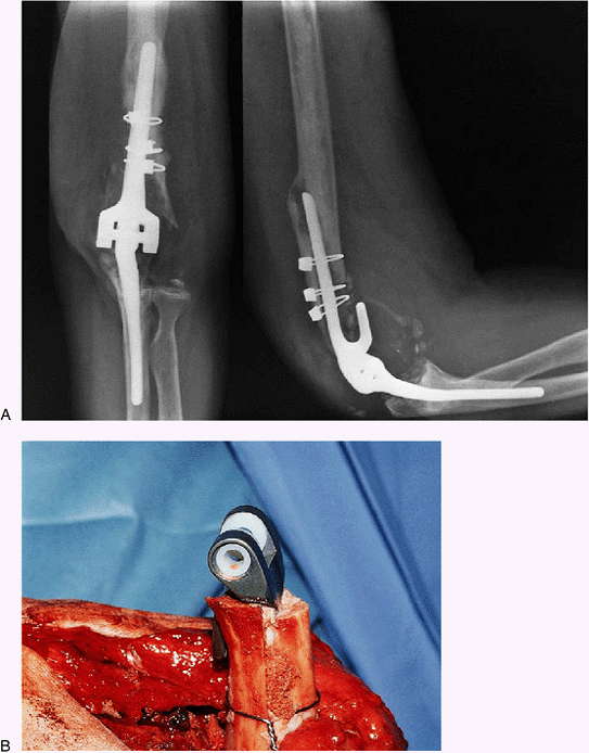 Figure 19-22. In instances of complete distal humeral deficiency (A), a posterior strut is added (B).