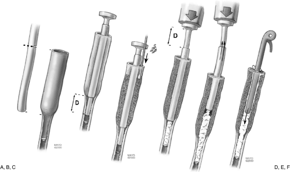 The cement is then mixed in the canister of the smaller elbow injector system and inserted on the nozzle in situ. Cement is injected through the nozzle while withdrawing to the level of the outer tube (Fig. 19-24D).