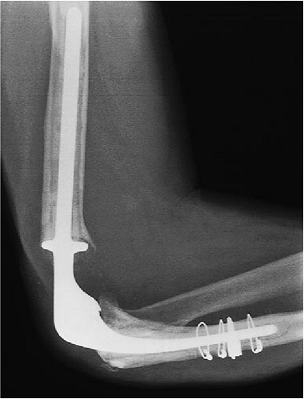 proximally and the tip eroding anterior (Fig. 19-29). With the technique described earlier, an allograft was used to replace the proximal ulna (Fig. 19-30). Bone graft was placed behind the anterior flange and a 150-cm humeral component was inserted down the humeral canal (Fig. 19-31). The patient has excellent motion 1 week after surgery. The radiograph shows a well-fixed implant (Fig. 19-32).