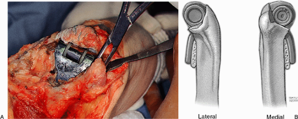 Figure 19-31. A,B: The humeral component is inserted and stabilized with a bone graft behind the flange of the prosthesis.