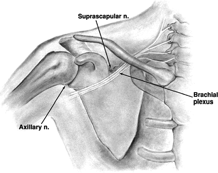 Figure 13.6. Schematic diagram showing the positions of the brachial plexus relative to the scapula.(From Bucholz RW, Heckman JD, Court-Brown C, et al., eds. Rockwood and Green’s Fractures in Adults, 6th ed. Philadelphia: Lippincott Williams & Wilkins, 2006.) -