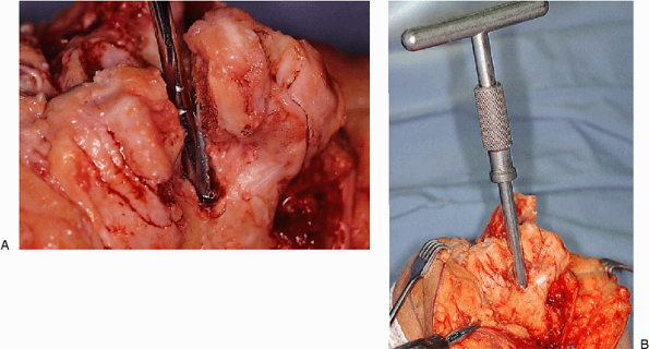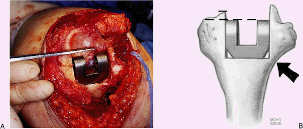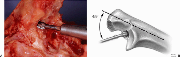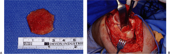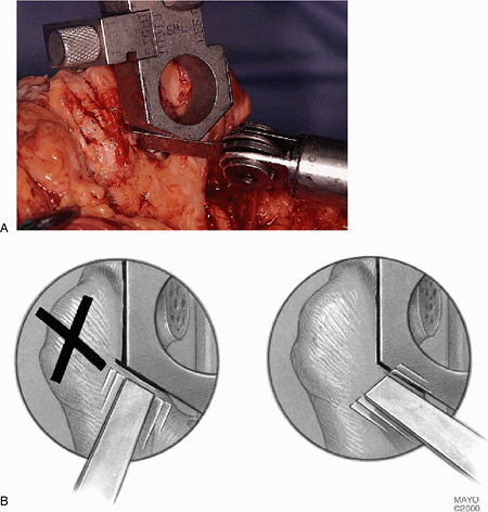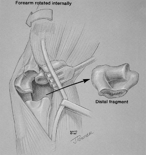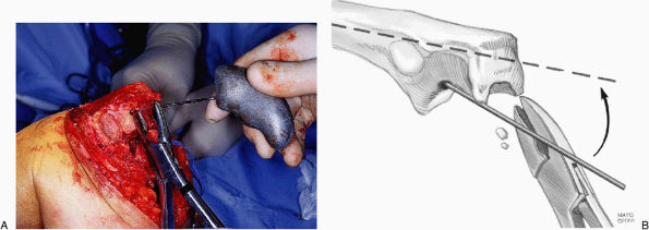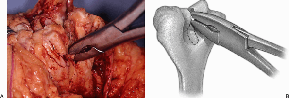 of the trochlea is removed with a rongeur or a saw, depending upon the quality of the bone (Fig. 18-10).