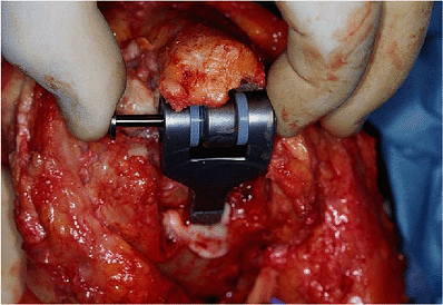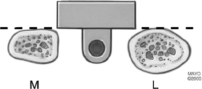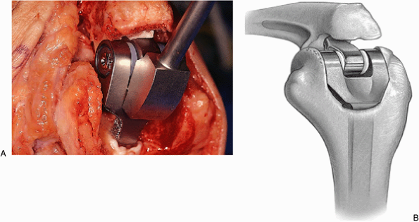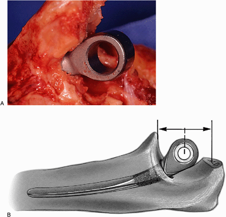In those with fixed contracture, the humerus is placed more proximally. The integrity of the medial column limits the depth of insertion. However, clinical experience indicates that medial epicondyle integrity is not essential for the implant to function in an effective manner. |