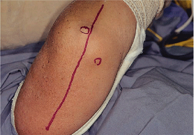 Figure 18-2. A straight incision is made between the medial epicondyle and the tip of the olecranon.