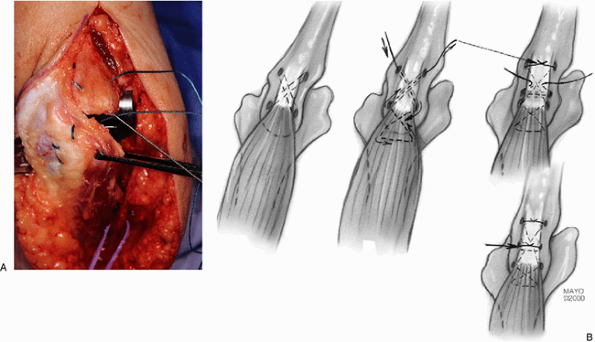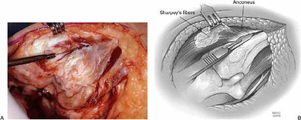 Figure 18-6. A,B: The anconeus is released and maintains the continuity of the extensor mechanism.