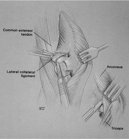 proximal ulna. This is elevated from its bed (Fig. 18-6). Continued release of the extensor mechanism from the lateral