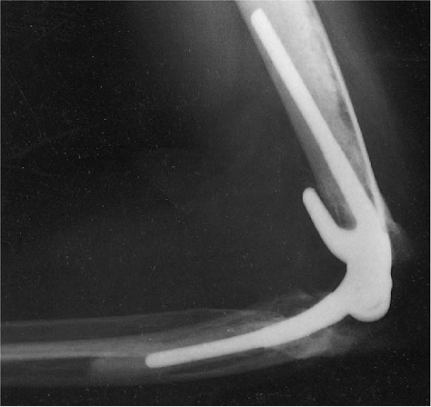 favorable long-term results (Fig. 18-47). At 5 years the patient is pain free, has an arc of motion of 25 to 135 degrees, and shows no evidence of loosening (Fig. 18-48).