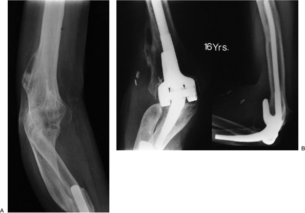 Figure 18-50. Severe deformity, spontaneously fused elbow, and one-bone forearm (A). Patient continues to function well 16 years after replacement (B).