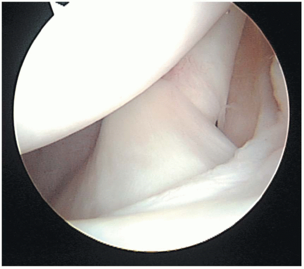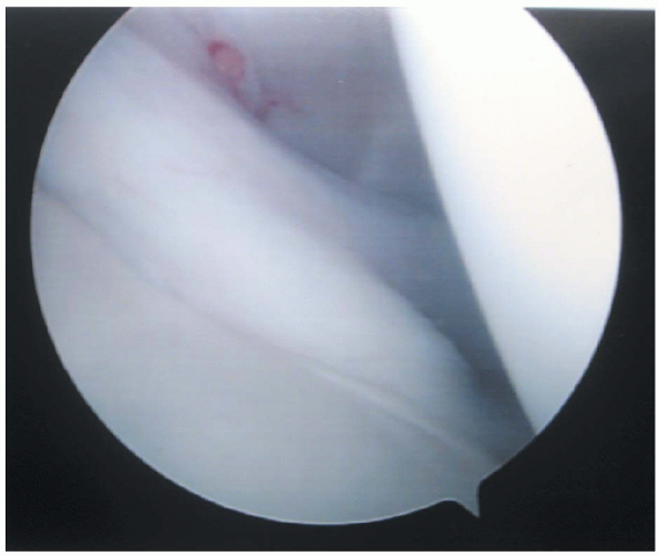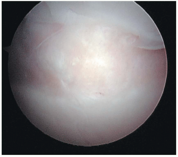 View from the posterior portal. The superior rolled edge of the subscapularis tendon can be clearly visualized in the anterior portion of the joint. Abduction and external rotation aid in the visualization of the superior insertion of the tendon at the bicipital groove. |