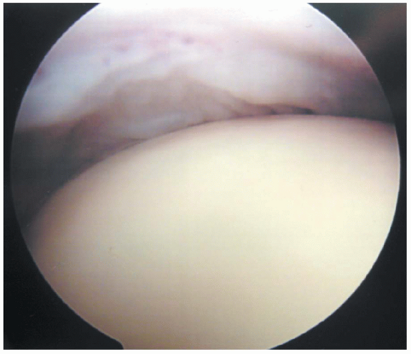 arthroscopy. It appears as a wedge-shaped defect toward the lateral