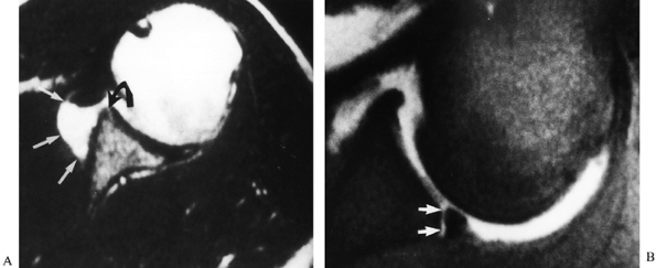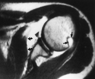 Figure 80.2. Axial MRI with contrast demonstrates anterior capsular stripping (large curved arrows) with an associated Bankart lesion. In addition, a large Hill–Sachs lesion can be seen posteriorly (smaller straight arrows).