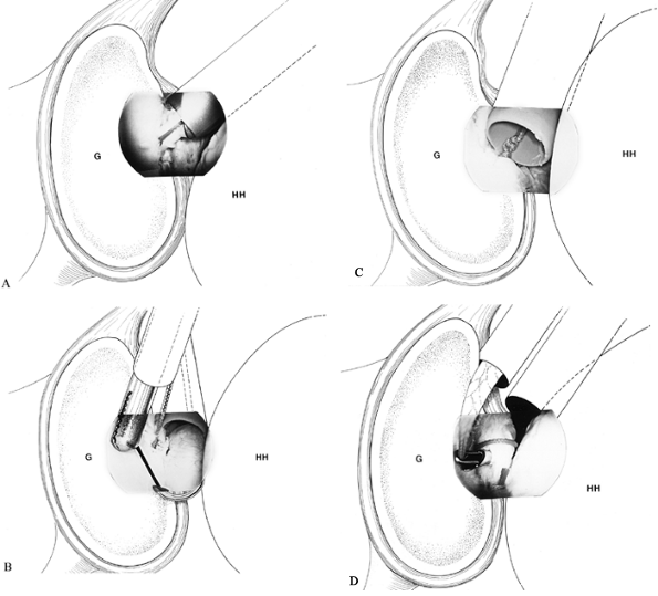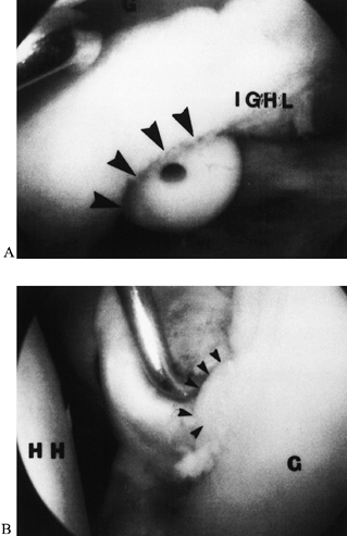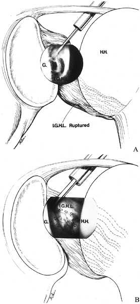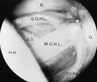 Figure 80.4. Arthroscopic view demonstrates normal anterior capsular ligamentous anatomy as viewed through a posterior arthroscopic portal (H.H., humeral head; G, glenoid; B, biceps tendon; S.G.H.L., superior glenohumeral ligament; S.S., subscapularis; M.G.H.L., middle glenohumeral ligament; I.G.H.L.,