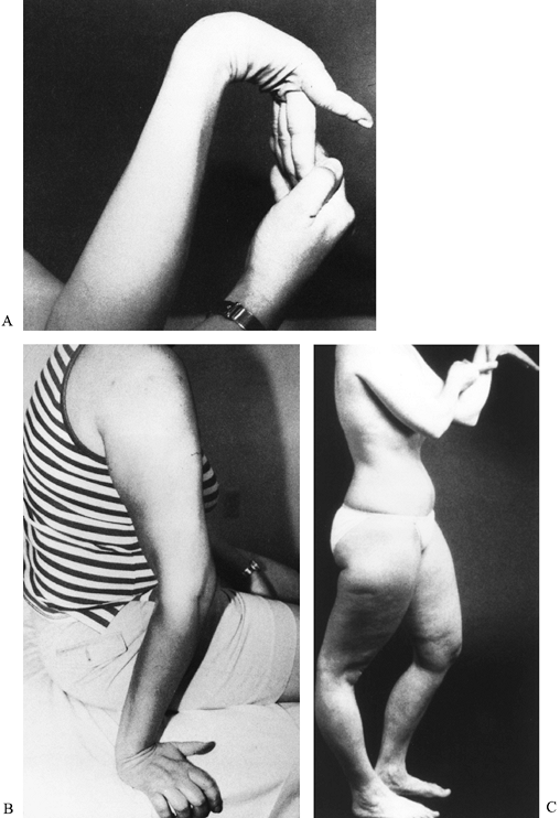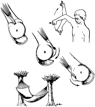 Figure 80.5. The IGHL controls glenohumeral instability in a manner analogous to a hammock. A: With the arm in 90° of abduction, the IGHL supports the humeral head inferiorly. B: With external rotation, the anterior band of the ligament prevents anterior translation of the humeral head. C: