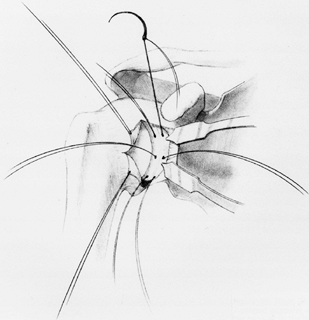 Arthroscopic view through a posterior portal demonstrates an anatomic variant of the anterior glenoid labrum referred to as a sublabral hole. This should not be confused with a true Bankart lesion or a superior labrum anterior posterior (SLAP) lesion. (From Warner JJP, Warren RF. Arthroscopic Bankart Repair Using a Cannulated Absorbable Fixation Device. Oper Tech Orthop 1991;1:192, with permission.) |