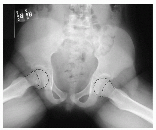 Figure 11-1 Anteroposterior pelvis radiograph showing widening of the right proximal femoral physis.