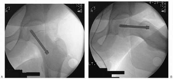 Figure 11-6 Operative anteroposterior (A) and frog-leg (B) radiographs showing single screw fixation.