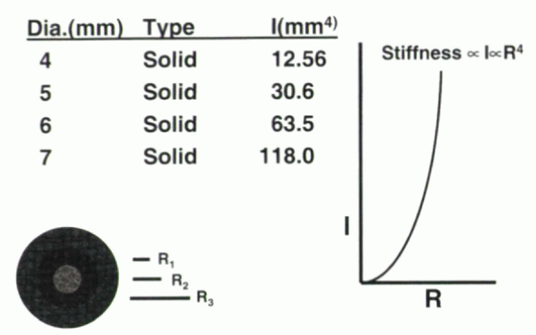 The moment of inertia for a cylindrical rod is proportional to the fourth power of the radius. Small increases in radii can manifest large increases in the moment of inertia and the resulting stiffness of the rod and construct. |
