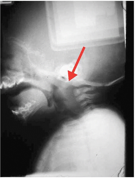 Increasingly over the past decade, MRI has become an important tool to avoid trouble when caring for a child with a possible occult cervical spine injury. MRI is particularly valuable to clear the cervical spine of a child who cannot cooperate with voluntary flexion and extension radiographs. This image allowed the diagnosis of ligamentous disruption at the occipitocervical junction (red arrow). |
