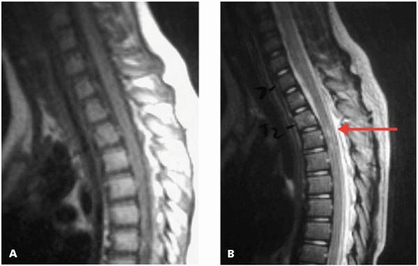SICWORA. This patient came into the ED with no neurologic deficits. Initial plain radiographs were read as normal. Paraplegia developed the next morning. MRI (A, B) increased 2 vertebral fractures and signal in the spinal cord, confirming injury (red arrow). |