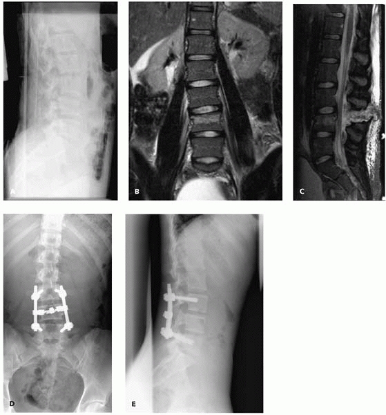 ▪ FIGURE 4-19 L4 chance fracture without neurologic injury (A). The MRI (B, C) shows both a bony component and complete ligamentous disruption, requiring a posterior instrumented spinal fusion (D, E).