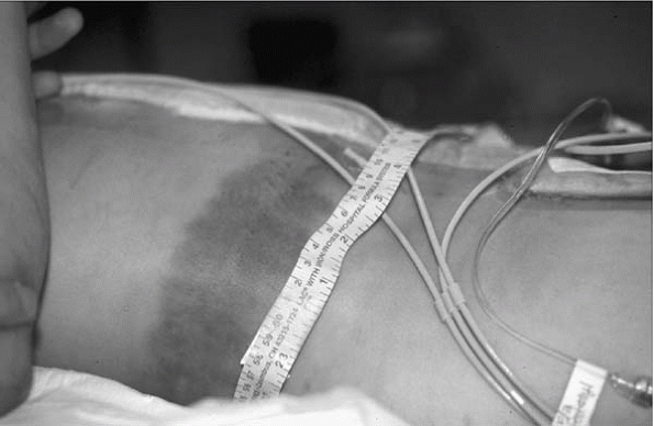 ▪ FIGURE 4-2 The lapbelt sign is a classic sentinel injury. When this skin finding is present, a lumbar spine injury should be sought.