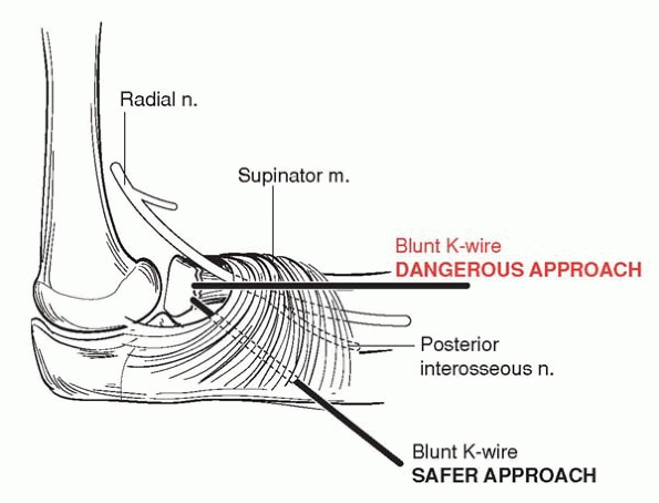 With the percutaneous manipulation maneuver for radial head fractures, be certain to avoid the posterior interosseous nerve.