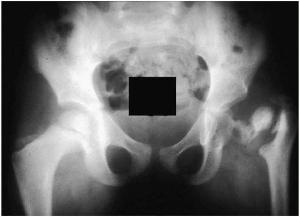 This AP radiograph was taken several weeks after a child with sickle cell disease showed signs of osteomyelitis of the fibula. Note the extent of diaphyseal involvement. Biopsy of the diaphysis can be more difficult; general anesthesia with fluoroscopic image localization is helpful. (Case courtesy of J. Dormans, MD.) |