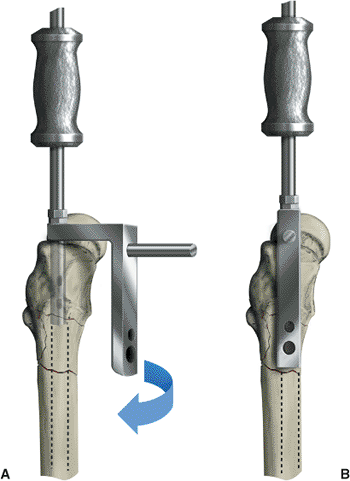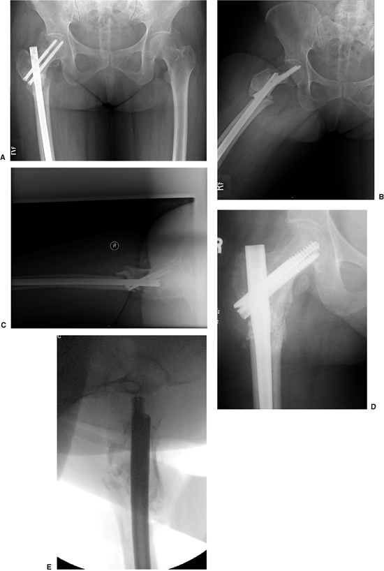 Preoperative nonunion of subtrochanteric fracture with malreduction of proximal fragment. Note poor bone apposition because of the malreduction. D,E. Postoperative appearance with percutaneous osteotomy and grafting with reduction of deformity and fixation through use of TriGen Intertan system. |