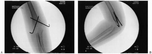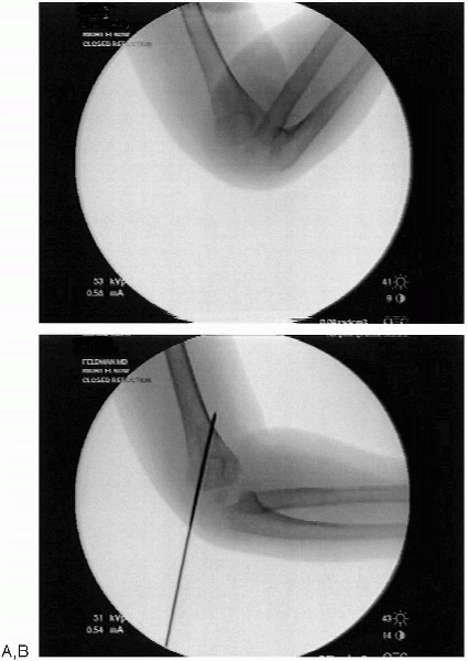 distal fragment. Confirmation of fragment placement is achieved with image intensification with the elbow in extension. Minimal traction is used to achieve this reduction (Fig. 12-8). -
