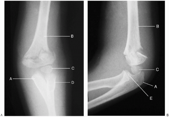 FIGURE 12-2. Type II extension supracondylar humerus fracture (left elbow). A: Anterior-posterior. B: Lateral. A, ulna; B, humerus; C, capitellar epiphysis; D, radius; E, radial head.