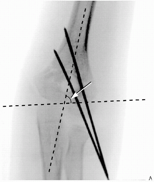 FIGURE 12-4. A: Two lateral pins used to obtain fixation for supracondylar humerus fracture. Note divergence of pins and Baumann’s angle (arrow).