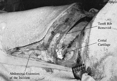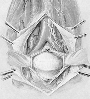 Figure 138.29. Make the incision one fingerbreadth lateral to the spinous process, spanning between the pedicles of the involved segment. -