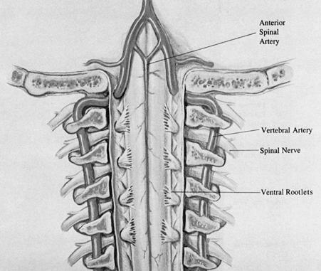 midline, then turns cephalad along the spinal cord to enter the foramen