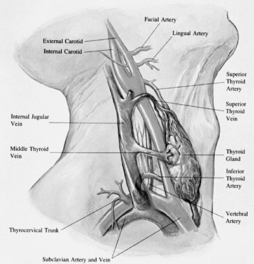 transversarium at the sixth vertebra and progresses cephalad. It exits