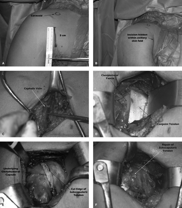 Figure 30-2 The concealed axillary approach. A: The concealed axillary incision. B: With the arm adducted, the incision is hidden in the axillary fold. C: Identification of the cephalic vein by mobilizing full-thickness skin flaps. D: Identification of the conjoint tendon. E: Incision of the subscapularis tendon. F: Repair of the subscapularis tendon.