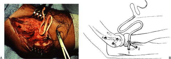 An entry site for the graft, hole No. 3, is then burred into the humerus at that point. Since the hole is bigger than the tip of the hemostat, one should make the hole posterior and proximal to the hemostat point (Fig. 15-8B inset). If it is placed distal or posterior, the tendon graft will be lax in extension and tight in flexion or vice versa. An exit site, hole No. 4, is created with the bur just posterior to the supracondylar ridge about 1.5 cm proximally and a tunnel created between the two with the curved and straight awls. A reentry site, hole No. 5, is created with the bur distally so that a bridge of bone, 1.25 cm, spans the two holes, and a tunnel is created from this site to the original entry site at the epicondyle where the tendon will exit again (hole No. 3). The tendon graft is then brought through the first two holes in the ulna, holes 1 and 2, and sutured to itself. |