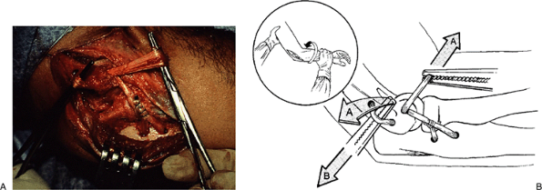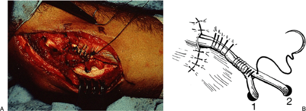 Figure 15-12. A,B: The graft is tensioned by pulling the proximal loop with a hemostat while pulling on the free end.