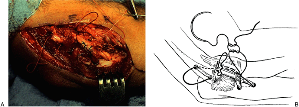 Figure 15-13. A,B: The free end is sutured to the remainder of the graft with the elbow in 40 degrees of flexion and forced pronation.