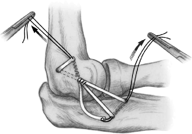 No. 3 (Fig. 15-11). It is tensioned (Fig. 15-12) and sutured down to itself with the elbow in 30 to 40 degrees of flexion and forced pronation (Fig. 15-13). The