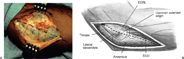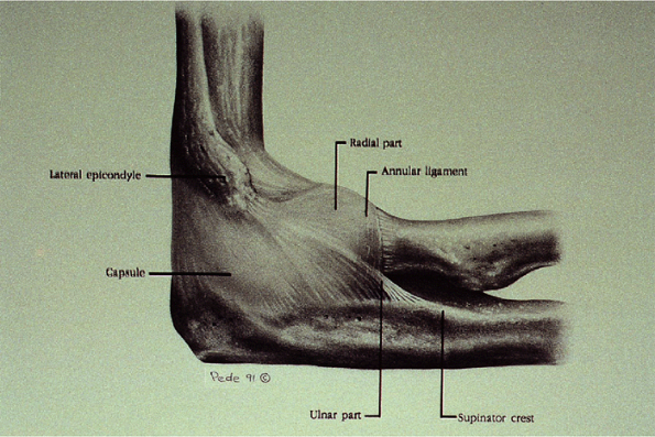 The lateral collateral ligament (LCL) is a complex of fibers consisting of the radial part, the ulnar part, and the annular ligament, all of which blend together. The ulnar part is indistinct at its origin on the lateral epicondyle. In fact, the common extensor origin also blends with this but has been excised for the purpose of this illustration. The ulnar part of the LCL arches over the annular ligament, with which it is closely integrated. It is most distinct along its anterior border as it inserts on the tubercle of the supinator crest. There is an additional fan-shaped insertion posterior to this, along the base of the annular ligament and just proximal to it. This gradually thins out until only the capsule remains. (Reprinted from O’Driscoll SW, Horii E, Morrey BF, et al. Anatomy of the ulnar part of the lateral collateral ligament of the elbow. Clin Anat 1992;5:296–303