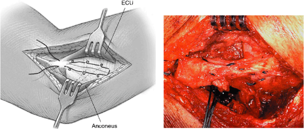 The capsule is closed and plicated, and the original arch of the ulnar part of the LCL is restored by pulling the graft anteriorly and suturing it to the capsule. This also prevents the graft from slipping posterior to the radial head. The capsule must be closed under the graft to prevent it from rubbing on the radial head or capitellum. |
