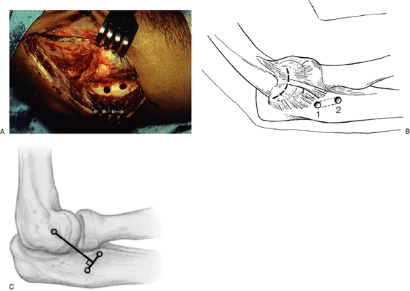 A No. 1 suture is passed through these two holes and grasped with a hemostat at the estimated isometric center of rotation of the elbow. The isometric ligament insertion is then determined by flexing and extending the elbow to see if the suture moves. No movement occurs if the suture and hemostat are on the isometric point. This point is usually more anterior than might be thought. |