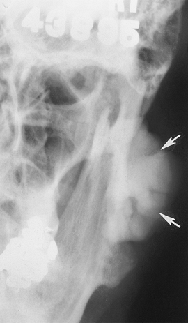 FIGURE 2-10 A 65-year-old patient with jaw swelling. Anteroposterior radiograph demonstrates a large benign osteoma (arrows).