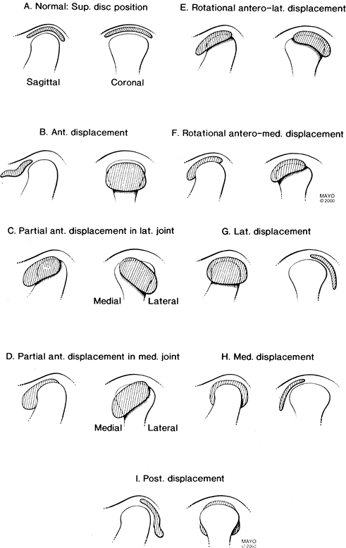 Anterior disc displacement occurs most commonly; 80% to 90% are bilateral.