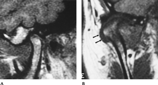 FIGURE 2-3 (A) Anterior disc displacement without (left) and with (right) reduction. Sagittal gradient echo (80/11, 30 degrees FA) images demonstrate a normal disc in open-mouth position (B) and an anteriorly displaced disc (arrow) (C).