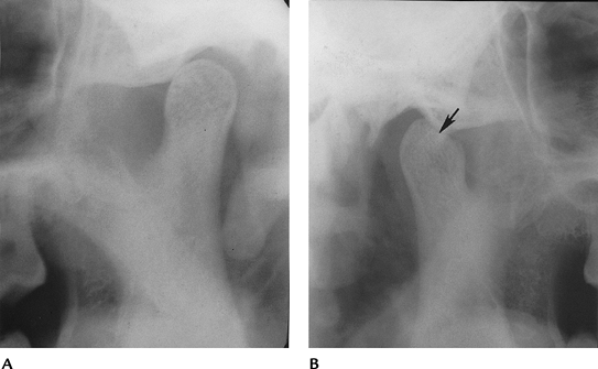 FIGURE 2-5 (A) Towne view demonstrating bilateral condylar neck fractures (arrows). (B) Coned-down lateral view demonstrating TMJ dislocation (broken lines define condyle and eminence).