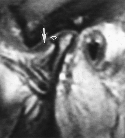 FIGURE 2-8 Sagittal T1-weighted MR image with anterior disc displacement (arrow) and a condylar osteophyte (open arrow).